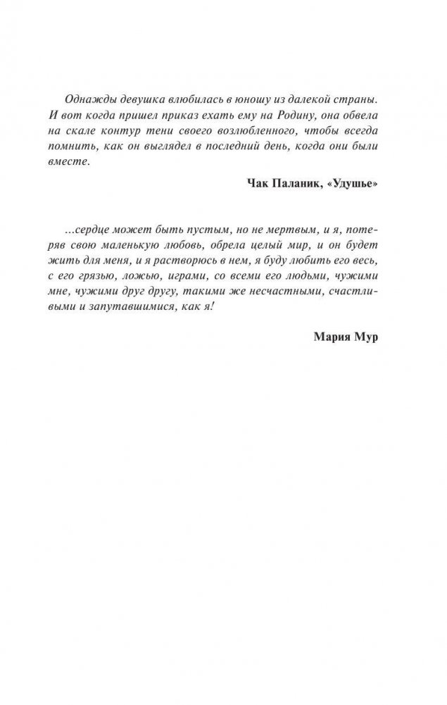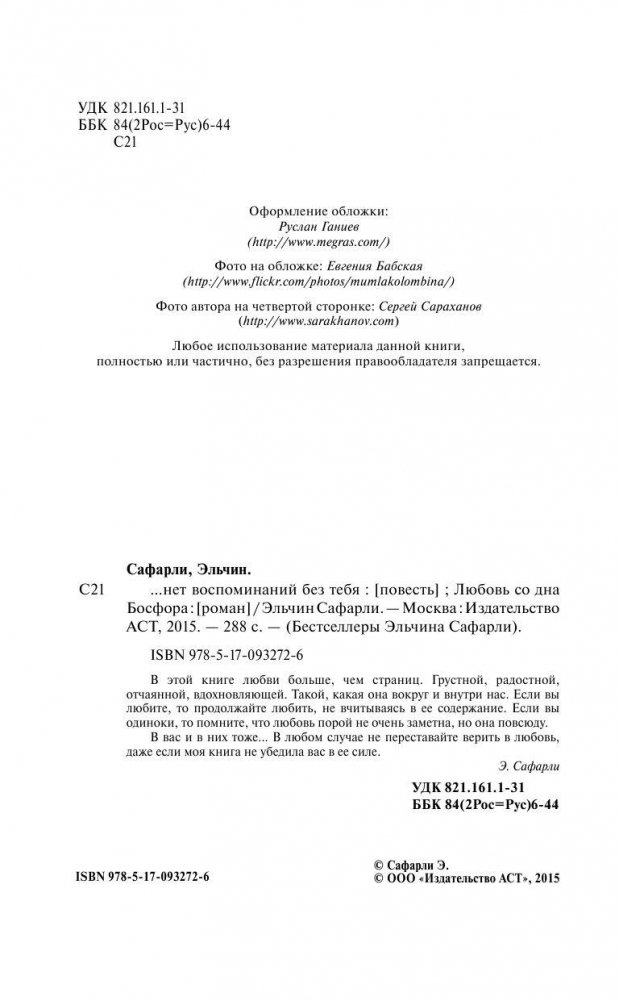 "В этой книге любви больше, чем страниц. Грустной, радостной, отчаянной, вдохновляющей. Такой, какая она вокруг и внутри нас. Если вы любите, то продолжайте любить, не вчитываясь в ее содержание. Если вы одиноки, то помните, что любовь порой не очень заметна, но она повсюду. В вас и в них тоже... В любом случае не переставайте верить в любовь, даже если моя книга не убедила вас в ее силе". (Э. Сафарли)