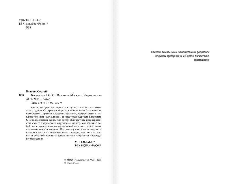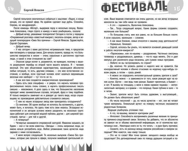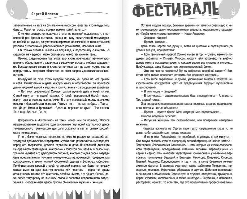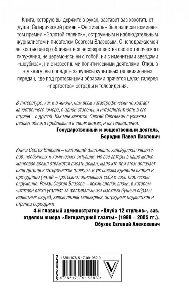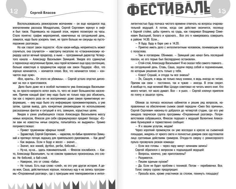 Книга, которую вы держите в руках, заставит вас хохотать от души. Сатирический роман «Фестиваль» был написан номинантом премии «Золотой теленок», остроумным и наблюдательным журналистом и писателем Сергеем Власовым. С неподражаемой легкостью автор обличает все несовершенства своего творческого окружения, не церемонясь ни с собой, ни с именитыми звездами «шоубиза», ни с известными политическими деятелями. Открыв эту книгу, вы попадете за кулисы культовых телевизионных передач, где под гротескными образами прячется целая галерея «портретов» эстрады и телевидения.