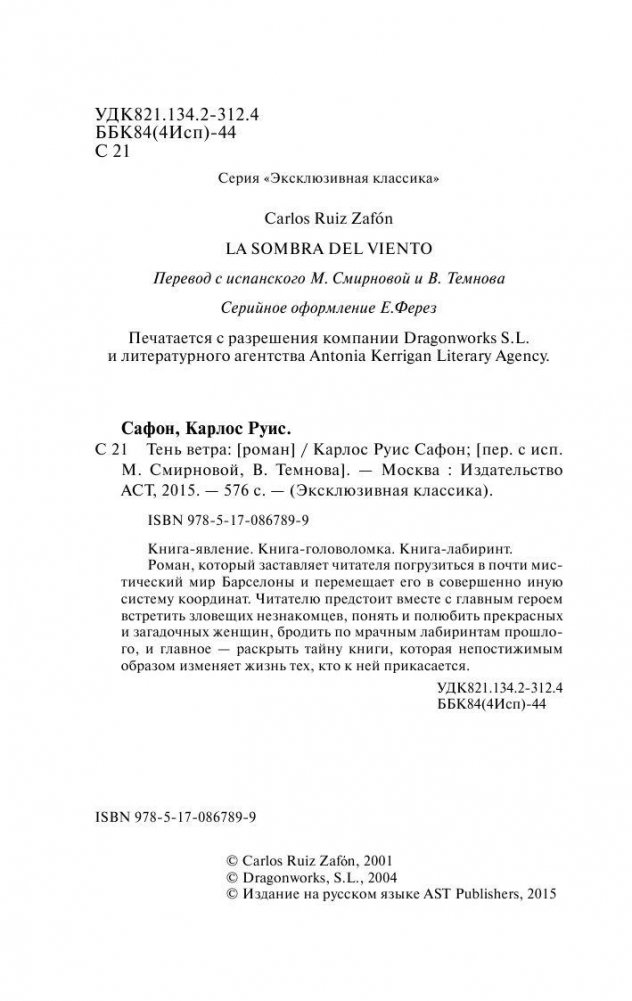 Книга-явление. Книга-головоломка. Книга-лабиринт. Роман, который заставляет читателя погрузиться в почти мистический мир Барселоны и перемещает его в совершенно иную систему координат. Читателю предстоит вместе с главным героем встретить зловещих незнакомцев, понять и полюбить прекрасных и загадочных женщин, бродить по мрачным лабиринтам прошлого, и главное — раскрыть тайну книги, которая непостижимым образом изменяет жизнь тех, кто к ней прикасается.