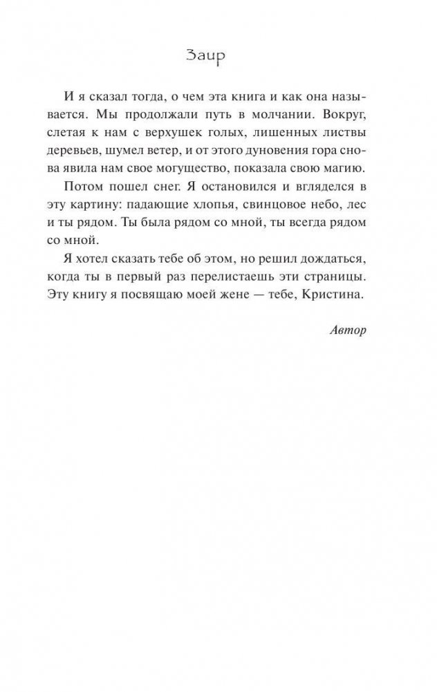 «Заир» - это захватывающая история писателя, жена которого, военная журналистка Эстер, однажды бесследно пропадает. Вскоре становится ясно, что она его бросила. Но он никак не может забыть ее и избавиться от навязчивого чувства, что за этим исчезновением кроется какая-то тайна. Он начинает искать Эстер, и с каждым днем его любовь к этой необыкновенной женщине лишь растет, постепенно становясь навождением…
