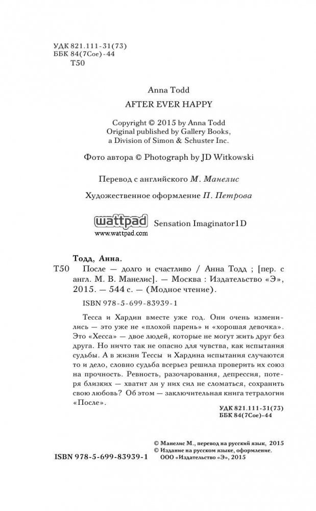 В отношениях Тессы и Хардина было столько падений и взлетов, ссор и примирений, расставаний и встреч, переживаний и радостей, что они и вправду превратились в единое целое — Хессу. В романе «После — долго и счастливо» паре предстоят финальный экзамен, настоящая проверка на прочность, которая должна доказать, что их чувства — настоящая любовь, а не юношеское увлечение. Что за трудности ждут Хардина и Тессу, как они преодолеют все невзгоды, каким будет их «долго и счастливо». Последний роман тетралогии Анны Тодд даст ответы на все вопросы.