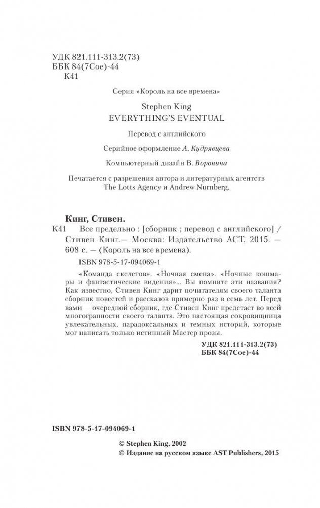 «Команда скелетов». «Ночная смена». «Ночные кошмары и фантастические видения». Вы помните эти названия? Как известно, Стивен Кинг дарит почитателям своего таланта сборник повестей и рассказов примерно раз в семь лет. Перед вами – очередной сборник, где Стивен Кинг предстает во всей многогранности своего таланта. Это настоящая сокровищница увлекательных, парадоксальных и темных историй, которые мог написать только истинный Мастер прозы.