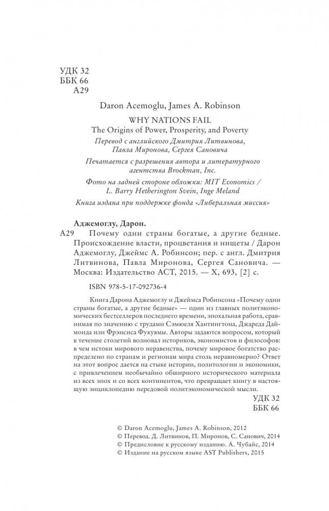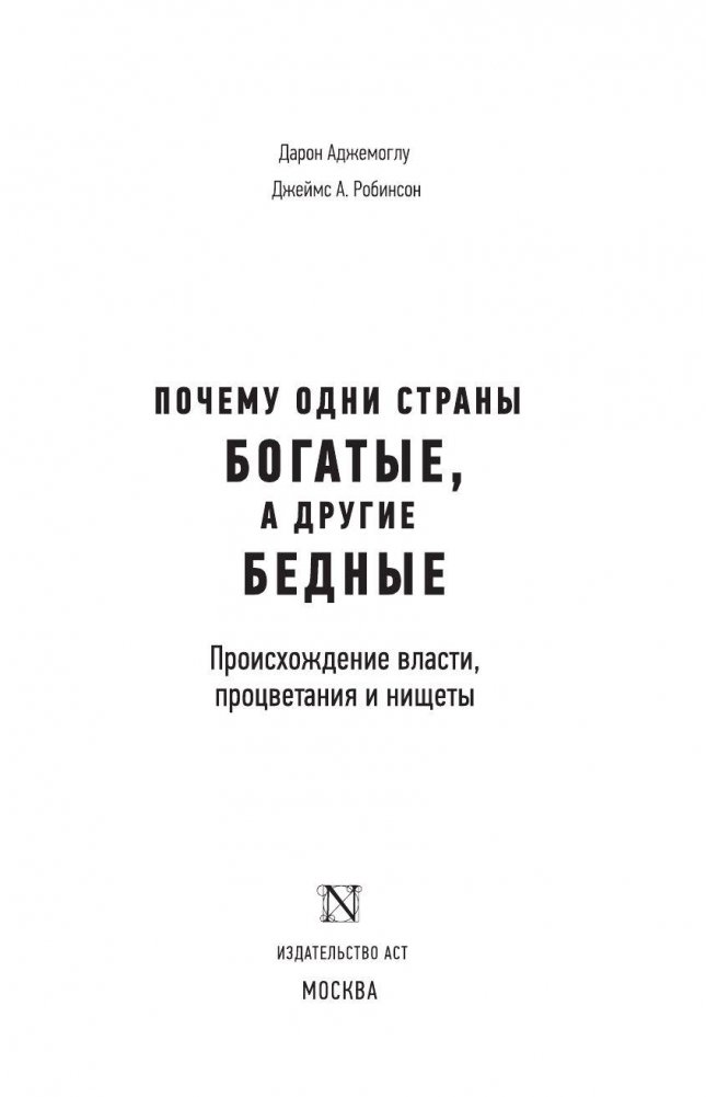 Книга Дарона Аджемоглу и Джеймса Робинсона «Почему одни страны богатые, а другие бедные» — один из главных политэкономических бестселлеров последнего времени, эпохальная работа, сравнимая по значению с трудами Сэмюеля Хантингтона, Джареда Даймонда или Фрэнсиса Фукуямы. Авторы задаются вопросом, который в течение столетий волновал историков, экономистов и философов: в чем истоки мирового неравенства, почему мировое богатство распределено по странам и регионам мира столь неравномерно? Ответ на этот вопрос дается на стыке истории, политологии и экономики, с привлечением необычайно обширного исторического материала из всех эпох и со всех континентов, что превращает книгу в настоящую энциклопедию передовой политэкономической мысли.