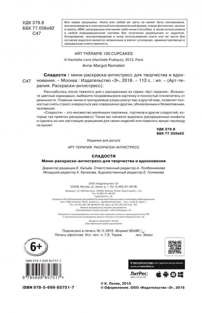 Расслабьтесь после тяжелого дня с раскрасками из серии «Арт-терапия». Возьмите цветные карандаши, выберите понравившуюся картинку и полностью отключитесь от реальности. Плавные линии и причудливые узоры унесут вас в другой мир, позволят полностью снять стресс и вернуться уже совершенно другим, обновленным и безмятежным, человеком. "Сладости" - это множество маленьких пирожных, тортиков и других сладостей, которые так приятно раскрашивать! Также вы сможете вырезать раскрашенные конфеты и сделать из них настоящие украшения для своих изделий или повесить яркую гирлянду на кухню!