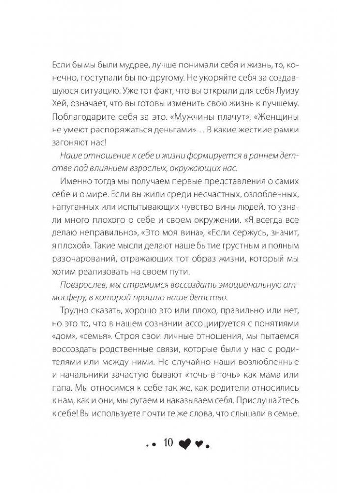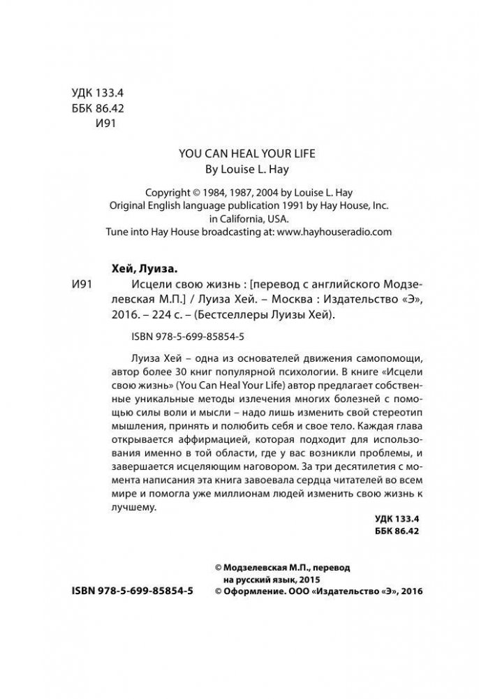 Луиза Хей – одна из основателей движения самопомощи, автор более 30 книг популярной психологии. В книге «Исцели свою жизнь» (You Can Heal Your Life) автор предлагает собственные уникальные методы излечения многих болезней с помощью силы воли и мысли – надо лишь изменить свой стереотип мышления, принять и полюбить себя и свое тело. Каждая глава открывается аффирмацией, которая подходит для использования именно в той области, где у вас возникли проблемы, и завершается исцеляющим наговором. За три десятилетия с момента написания эта книга завоевала сердца читателей во всем мире и помогла уже миллионам людей изменить свою жизнь к лучшему.