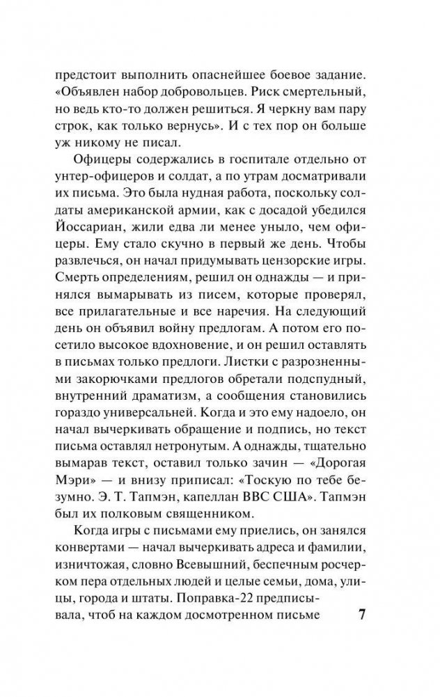 Прошло полвека со времени первой публикации, но «Поправка-22» по-прежнему остается краеугольным камнем американской литературы и одной из самых знаменитых книг всех времен. «Time», «Newsweek», «Modern Library», «London Observer» включили ее в списки «лучших романов», а в списке «200 лучших книг по версии BBC» она занимает 11 место. Эта оригинальная история о службе летчиков ВВС США в период Второй мировой войны полна несуразных ситуаций, не менее несуразных смешных диалогов, безумных персонажей и абсурдных бюрократических коллизий, связанных с некой не существующей на бумаге, но от этого не менее действенной «поправкой-22» в законе, гласящей о том, что «всякий, кто хочет уклониться от боевого задания, нормален и, следовательно, годен к строевой»… Это произведение сложно назвать просто антивоенным романом. Это глубокая всеобъемлющая сатира на нашу повседневность, образ жизни и принципы «цивилизованного» общества.
