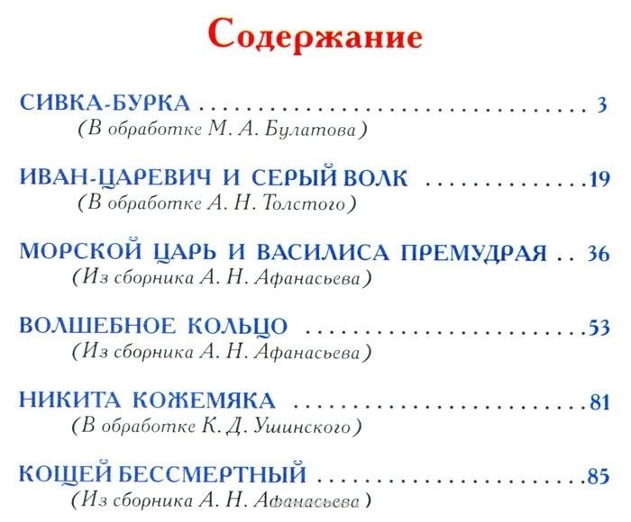 В книгу вошли произведения: М.А. Булатов «Сивка-Бурка», А.Н. Толстой «Иван-царевич и серый вол», А.Н. Афанасьев «Морской царь и Василиса Премудрая», «Волшебное кольцо», «Белая уточка», К.Д. Ушинский «Никита Кожемяка». Иллюстрации А. Лебедева и В. Нечитайло.