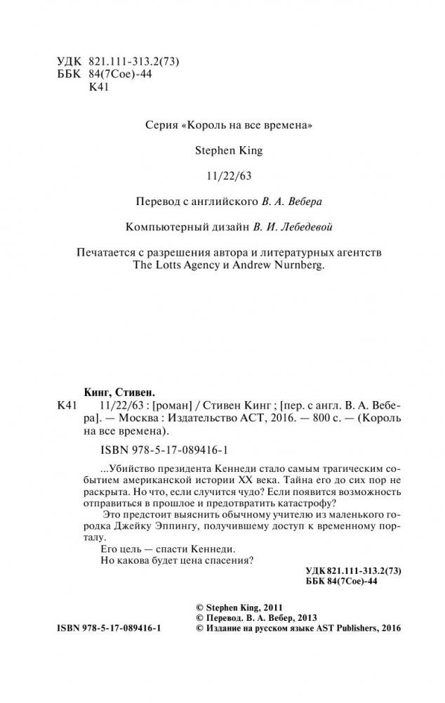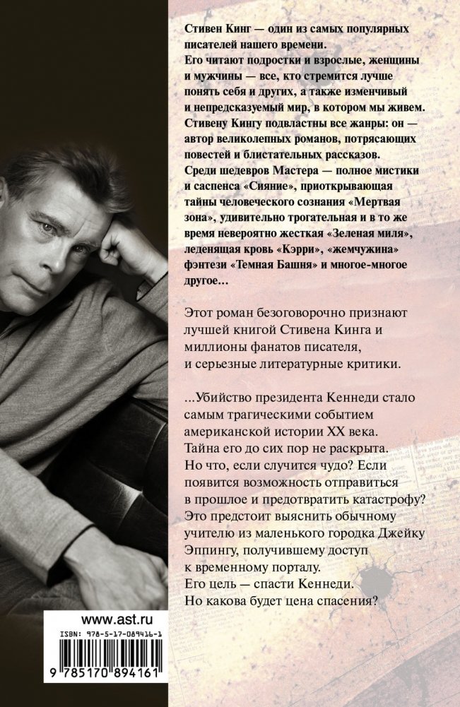 Убийство президента Кеннеди стало самым трагическим событием американской истории ХХ века. Тайна его до сих пор не раскрыта. Но что, если случится чудо? Если появится возможность отправиться в прошлое и предотвратить катастрофу? Это предстоит выяснить обычному учителю из маленького городка Джейку Эппингу, получившему доступ к временному порталу. Его цель – спасти Кеннеди. Но какова будет цена спасения?