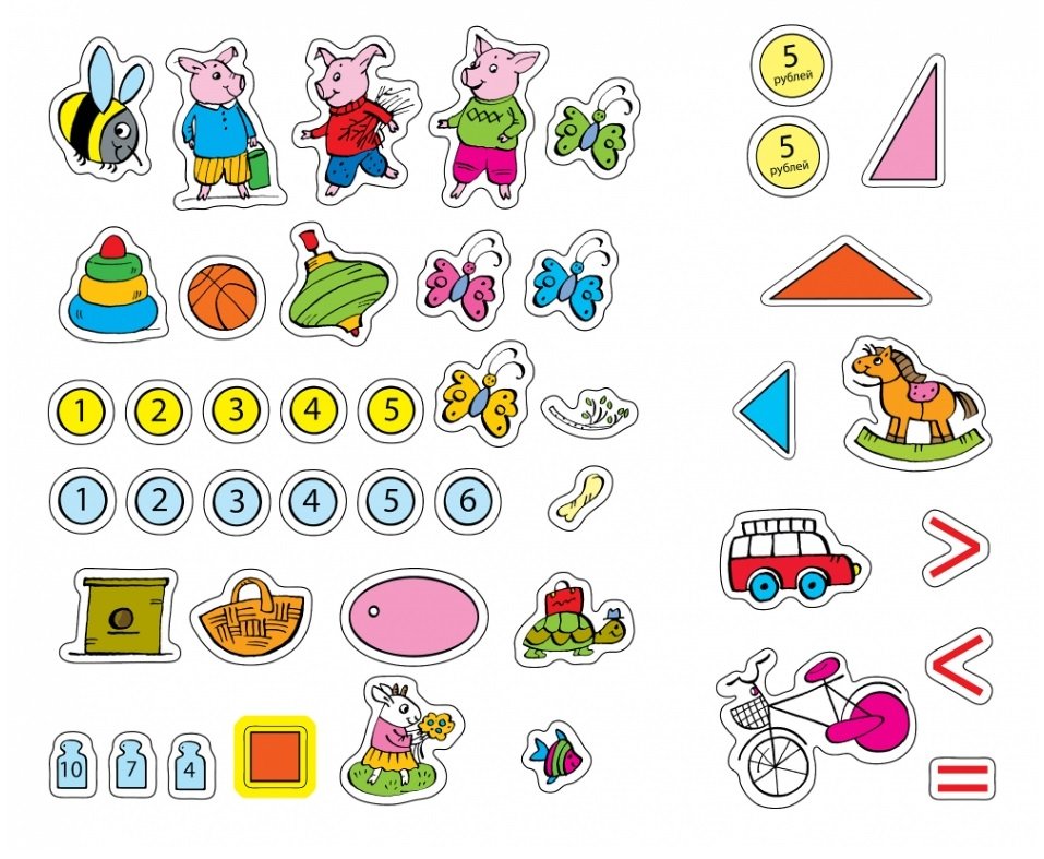 Уважаемые взрослые! Занимаясь по этой книжке, ваш ребенок закрепит свои знания о геометрических фигурах, научится ориентироваться в пространстве и на листе бумаги, считать до десяти в прямом и обратном порядке, определять количество предметов, узнавать и правильно записывать цифры. Маленький ученик познакомится с составом числа, математическими знаками и сможет решить не только примеры и неравенства, но и простые задачи. Наклеивание картинок сделает процесс обучения увлекательным занятием и поможет развить мелкую моторику и координацию движений руки. Ребенку нужно найти на вкладыше подходящую наклейку и приклеить ее на страничку с заданием. Желаем успехов! Для чтения взрослыми детям 4-5 лет.