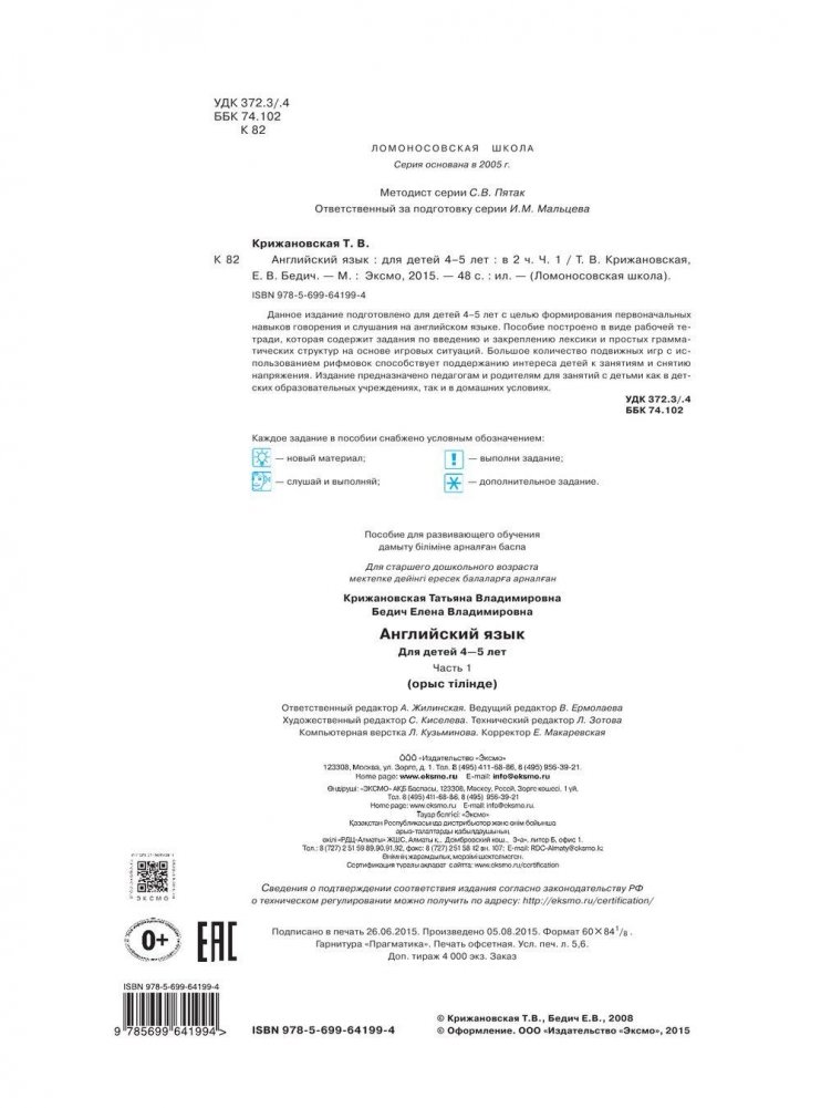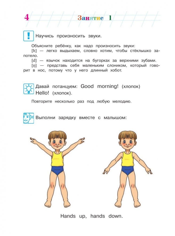 Данное издание подготовлено для детей 4–5 лет с целью формирования первоначальных навыков говорения и слушания на английском языке. Пособие построено в виде рабочей тетради, которая содержит задания по введению и закреплению лексики и простых грамматических структур на основе игровых ситуаций. Большое количество подвижных игр с использованием рифмовок способствует поддержанию интереса детей к занятиям и снятию напряжения. Издание предназначено педагогам и родителям для занятий с детьми как в детских образовательных учреждениях, так и в домашних условиях.