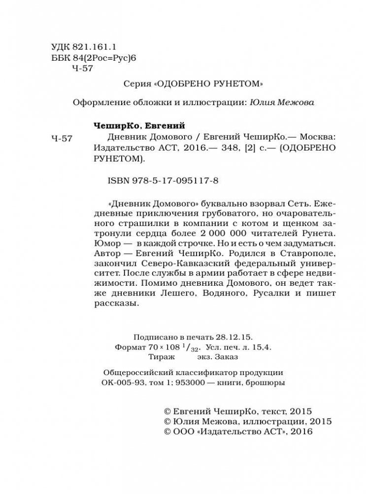 «Дневник Домового» буквально взорвал Сеть. Ежедневные приключения грубоватого, но очаровательного страшилки в компании с котом и щенком затронули сердца более 2 000 000 читателей Рунета. Юмор – в каждой строчке. Но и есть о чем задуматься. Автор – Евгений ЧеширКо. Родился в Ставрополе, закончил Северо-Кавказский федеральный университет. После службы в армии работает в сфере недвижимости. Помимо дневника Домового, он ведет так же дневники Лешего, Водяного, Русалки и пишет рассказы.