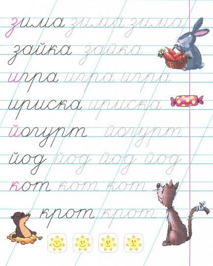 Эти прописи помогут ребёнку в игровой форме развить зрительное восприятие, внимание, мелкую моторику и координацию движения руки. Чтобы малыш не уставал, прописи не перегружены упражнениями, слова даны в увеличенном виде, а на разворотах расположены забавные рисунки, свазанные с выполняемыми заданиями. Буквы, выделенные красным цветом, стоят по алфавиту. Занимайтесь с ребёнком не более 20-25 минут. Обязательно оцените старания маленького ученика и похвалите его за усердие. Предложите ребёнку самостоятельно оценить выполненную им на странице работу — обвести солнышко с соответствующей оценкой.