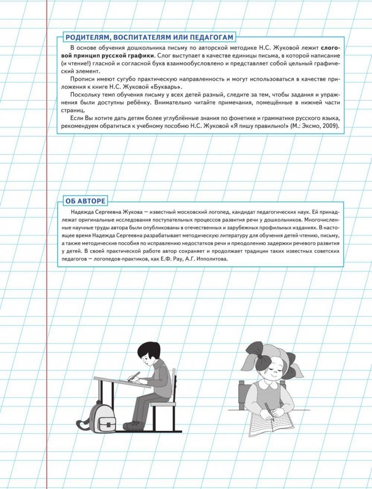 В основе обучения дошкольника письму по авторской методике Н.С. Жуковой лежит слоговой принцип русской графики. Слог выступает в качестве единицы письма, в которой написание (и чтение!) гласной и согласной букв взаимообусловлено и представляет собой цельный графический элемент. Прописи имеют сугубо практическую направленность и могут использоваться в качестве приложения к книге Н.С. Жуковой «Букварь». Поскольку темп обучения письму у всех детей разный, следите за тем, чтобы задания и упражнения были доступны ребёнку. Внимательно читайте примечания, помещённые в нижней части страниц. Если Вы хотите дать детям более углублённые знания по фонетике и грамматике русского языка, рекомендуем обратиться к учебному пособию Н.С. Жуковой «Я пишу правильно!»