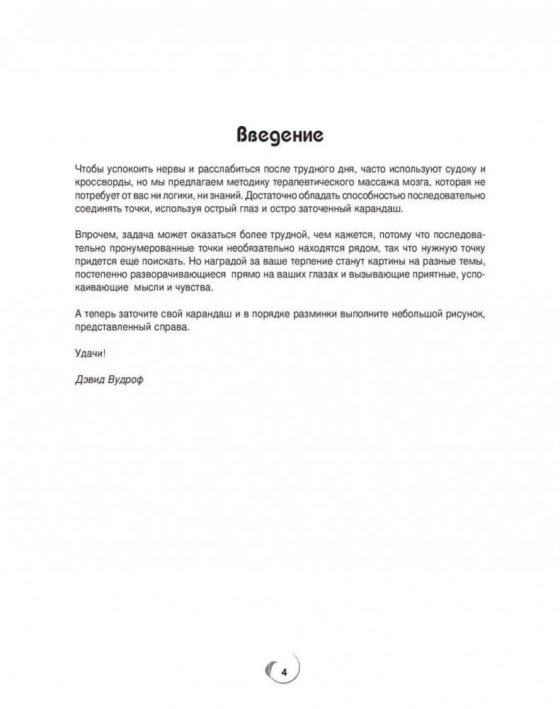 Эта замечательная коллекция рисунков-головоломок познакомит вас с волшебным миром рисования по точкам, где достаточно соединять простыми штрихами соседние точки, чтобы вашим глазам чудесным образом открылись детальные картины. Для широкого круга любителей головоломок.