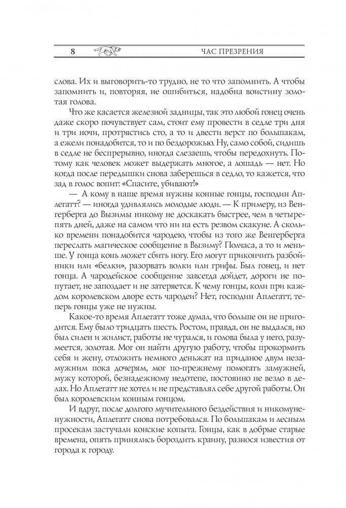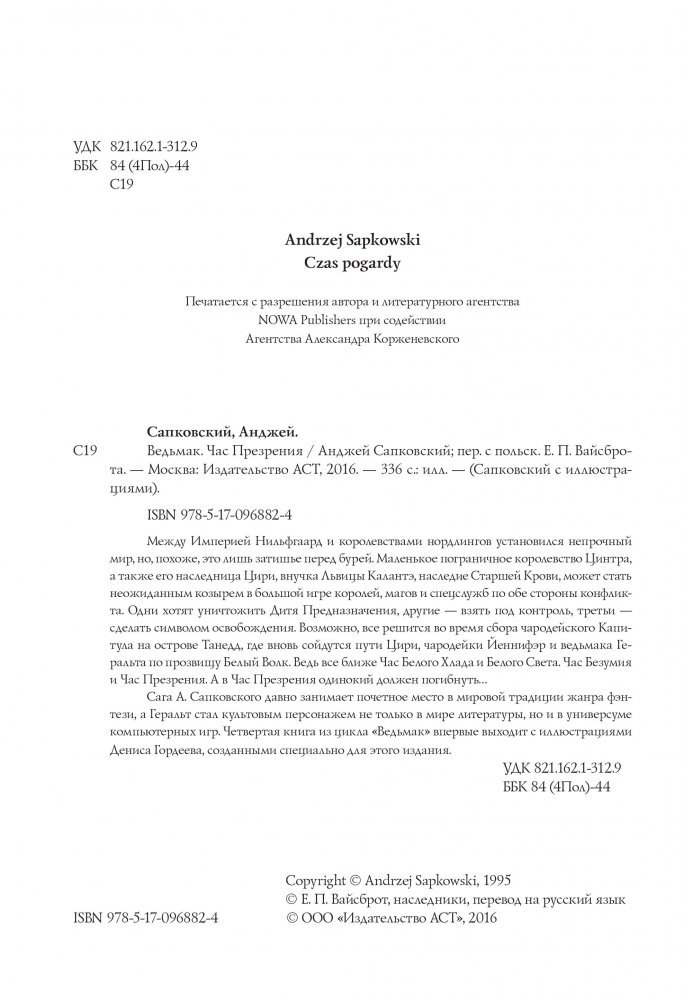 Между Империей Нильфгаард и королевствами нордлингов установился непрочный мир, но, похоже, это лишь затишье перед бурей. Маленькое пограничное королевство Цинтра, а также его наследница Цири, внучка Львицы Калантэ, наследие Старшей Крови, может стать неожиданным козырем в большой игре королей, магов и спецслужб по обе стороны конфликта. Одни хотят уничтожить Дитя-Предназначение, другие – взять под контроль, третьи – сделать символом освобождения. Возможно, все решится во время сбора чародейского Капитула на острове Танедд, где вновь сойдутся пути Цири, чародейки Йеннифэр и ведьмака Геральта по прозвищу Белый Волк. Ведь все ближе Час Белого Хлада и Белого Света. Час Безумия и Час Презрения. А в Час Презрения одинокий должен погибнуть…
