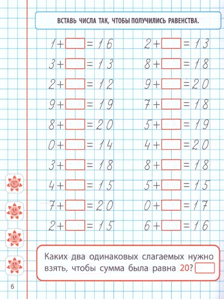 Это учебное пособие будет способствовать эффективному изучению математики в 1-м классе. В простой и доступной форме оно позволит развить, закрепить и проверить ключевые навыки ребёнка по самым важным темам изучаемого предмета. Специально подобранные примеры и задания помогут не только овладеть простейшими арифметическими действиями сложения и вычитания в пределах 20, но и научат правильно оформлять математические примеры и задачи. Все задания чётко сформированы и систематизированы в пределах одной страницы. Выполненную на каждой странице работу ребёнок может самостоятельно оценить — обвести на полях солнышко с соответствующей оценкой.