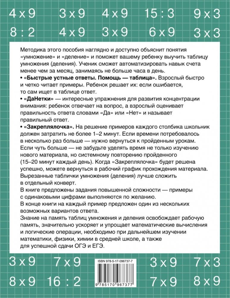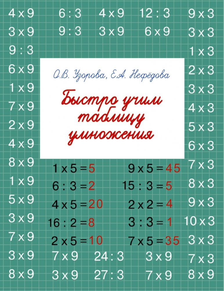 Данное учебное пособие основано на авторской методике педагогов-практиков О.В. Узоровой и Е.А. Нефёдовой и поможет вашему ребенку быстро и легко освоить таблицу умножения. С помощью данной методики ребенок сможет автоматизировать свои навыки табличного умножения, что ускорит и упростит любые вычисления при дальнейшем обучении математике.