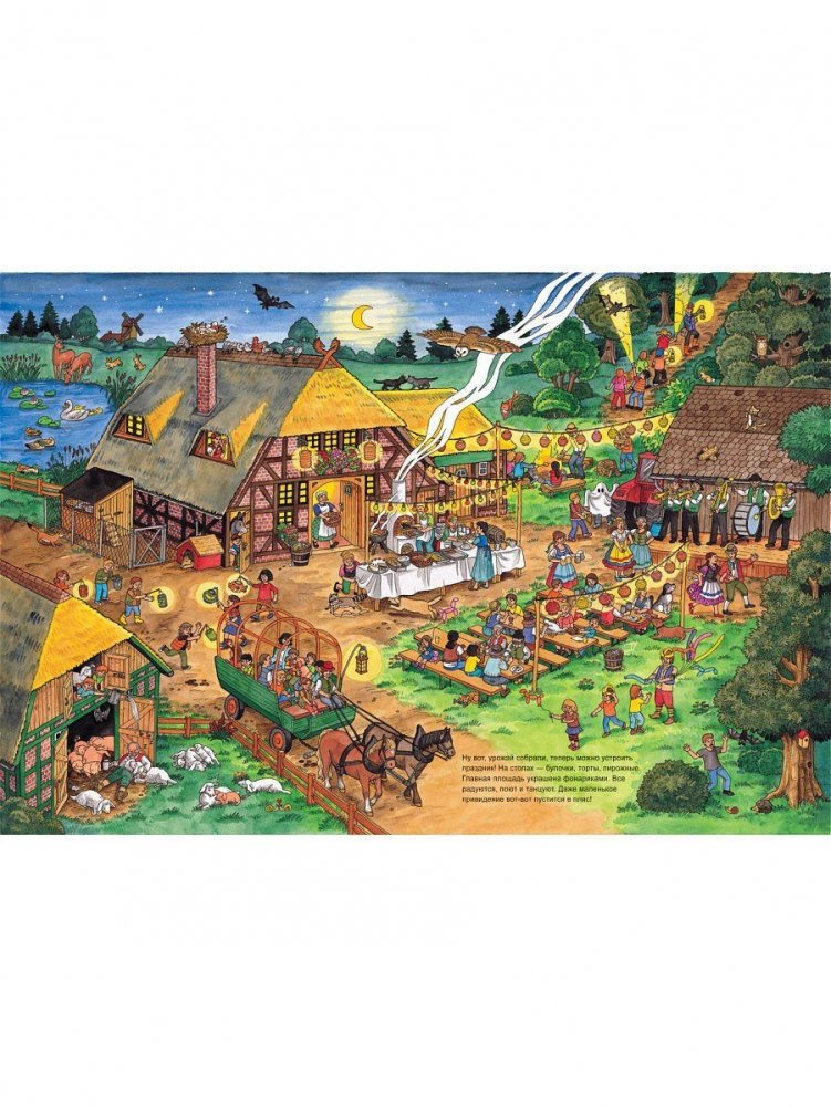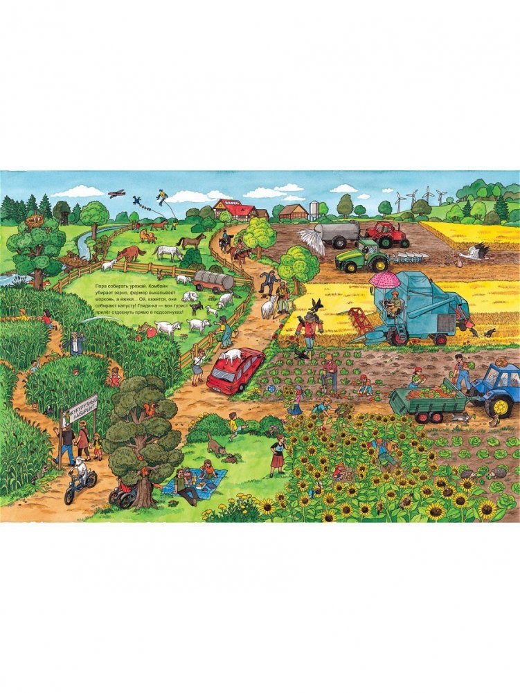Давай отправимся в деревню! Там ужасно интересно! Смотри сам: вот фермеры собирают урожай, трактор боронит поле, а дети запускают воздушных змеев. А вот и деревенский праздник. Тут и поют, и танцуют, а кое-кто отправился в поход. И еще на каждом развороте спрятался любопытный енот. Попробуй-ка его отыскать! Книжки-картинки с яркими, забавными иллюстрациями со множеством интересных и неожиданных деталей непременно понравятся детям. Ведь их можно разглядывать бесконечно долго и каждый раз находить что-то новое!