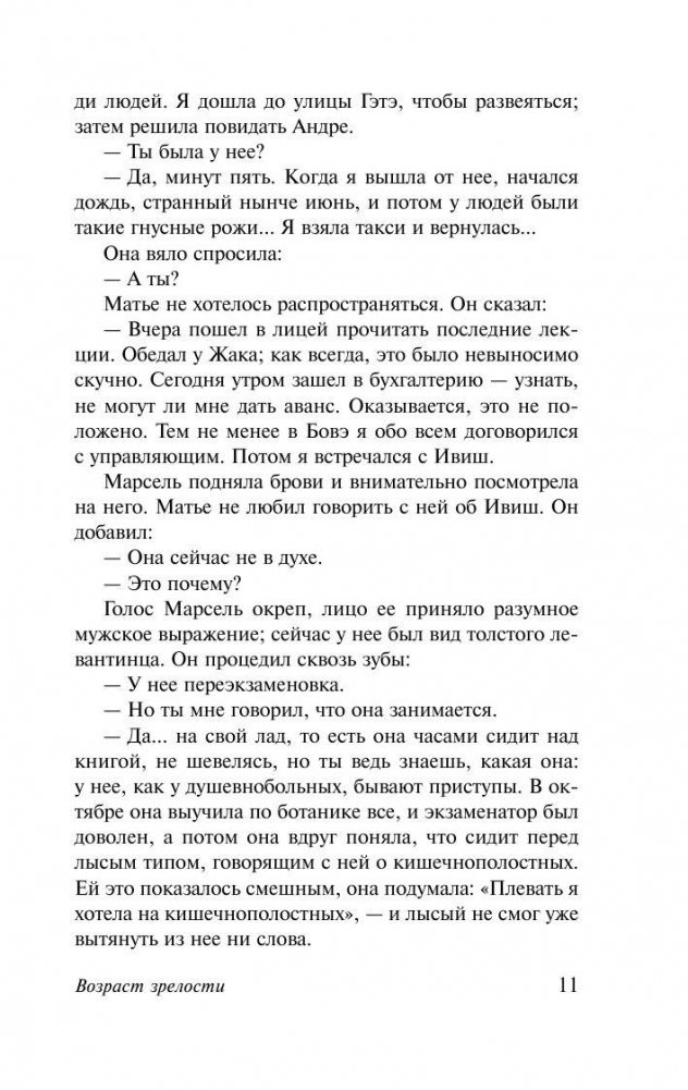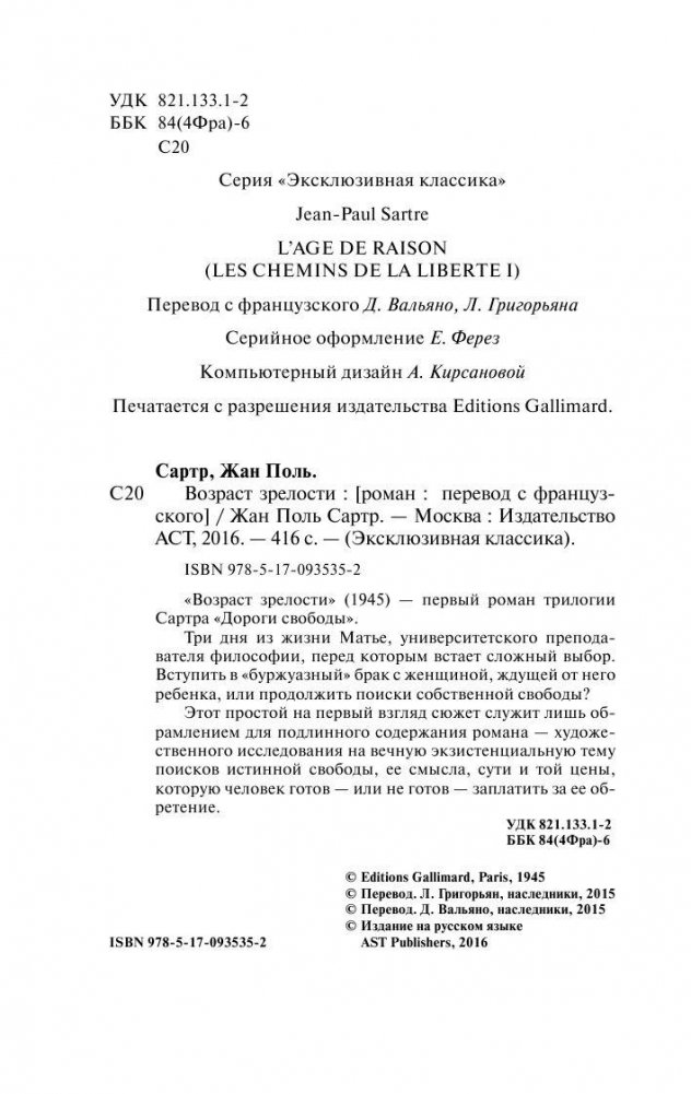 «Возраст зрелости» (1945) — первый роман трилогии Сартра «Дороги свободы». Три дня из жизни Матье, университетского преподавателя философии, перед которым встает сложный выбор. Вступить в «буржуазный» брак с женщиной, ждущей от него ребенка, или продолжить поиски собственной свободы? Этот простой на первый взгляд сюжет служит лишь обрамлением для подлинного содержания романа — художественного исследования на вечную экзистенциальную тему поисков истинной свободы, ее смысла, сути и той цены, которую человек готов — или не готов — заплатить за ее обретение.