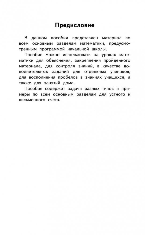 Данное пособие предназначено в качестве дополнительного материала по математике для учащихся 1-4 классов. При помощи регулярного решения представленных в пособии примеров, ребенок сможет сформировать свои математические знания, умения и навыки, обучится письменным и устным вычислениями, ознакомившись с методами решения задач, проходимых в начальной школе. Пособие рекомендуется учителям младших классов, репетиторам и родителям.