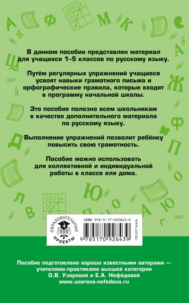 В это издании находится материал для учеников 1-5 классов по русскому языку. Приведенные в нем упражнения позволят ребенку повысить грамотность, усвоить правила орфографии. Пособие рекомендуется школьникам в качестве дополнительного материала по русскому языку, его можно использовать как для классной, так и для индивидуальной работы дома.
