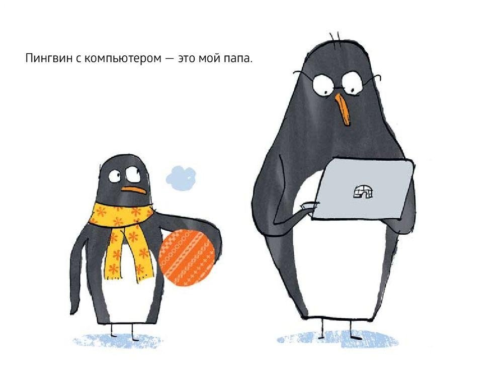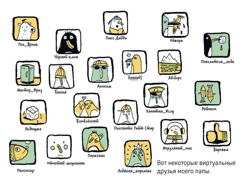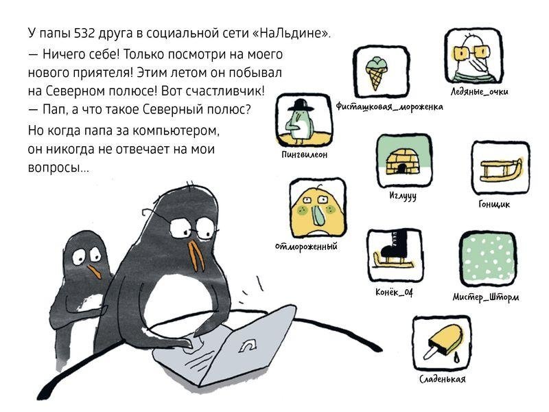 Папа-пингвин вечно онлайн. Утром он читает новости и смотрит погоду, вечером общается с виртуальными друзьями в социальнои? сети НаЛьдине. Вся его жизнь — в интернете, а свою семью он совсем не замечает. Но вот однажды связь пропадает, и папа оказывается один на льдине, которая уносит его далеко в океан. Эта простая история, рассказанная от лица малыша-пингвина, станет отличным поводом к разговору с ребенком об интернете и о том, как важно беречь и ценить близких людей и жить реальной жизнью, а не онлайн.