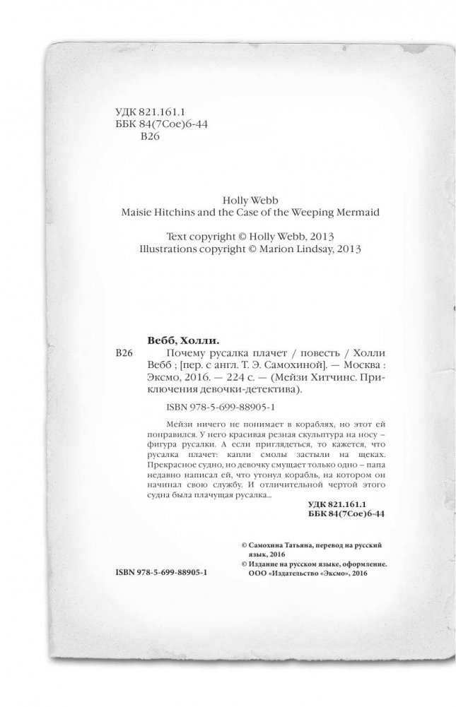 Мейзи ничего не понимает в кораблях, но этот ей понравился. У него красивая резная скульптура на носу – фигура русалки. А если приглядеться, то кажется, что русалка плачет: капли смолы застыли на щеках. Прекрасное судно, но девочку смущает только одно – папа недавно написал ей, что утонул корабль, на котором он начинал свою службу. И отличительной чертой этого судна была плачущая русалка…
