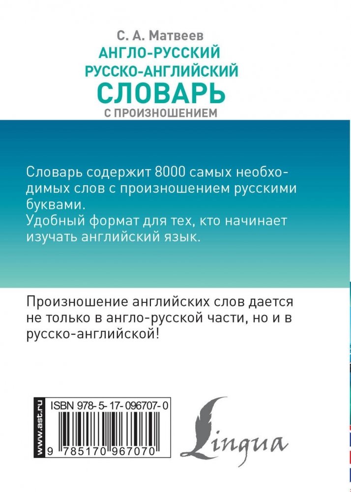 Сергей Матвеев, известный автор словарей и пособий по иностранным языкам, предлагает англо-русский и русско-английский словарь для начинающих учить английский язык. В каждой части содержится по 4 тыс. самых употребительных слов. Все слова в англо-русской части снабжены транскрипцией русскими буквами, причем транскрипция английских слов дается и в русско-английской части. В конце каждой части есть список неправильных глаголов. Словарь предназначен для всех, кто учит английский язык.