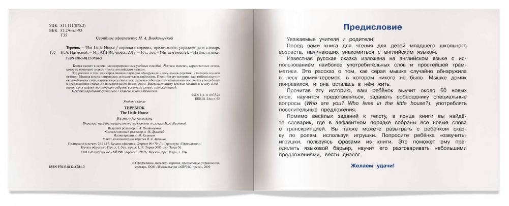 Книга для детей дошкольного и младшего школьного возраста, которая станет отличным интерактивным помощником для тех, кто только начал знакомиться с английским языком. "Теремок" входит в серию иллюстрированных учебных пособий "Читаем вместе". Структура книжки ориентирована на то, чтобы после знакомства с содержанием ребенок научился представляться, задавать собеседнику специальные вопросы, употреблять повелительные предложения. Прочтя ее, малыш пополнит свой словарный запас. А самое главное, что ребенку не придется скучать - книгу сопровождают веселые задания, выполнять которые одно удовольствие.