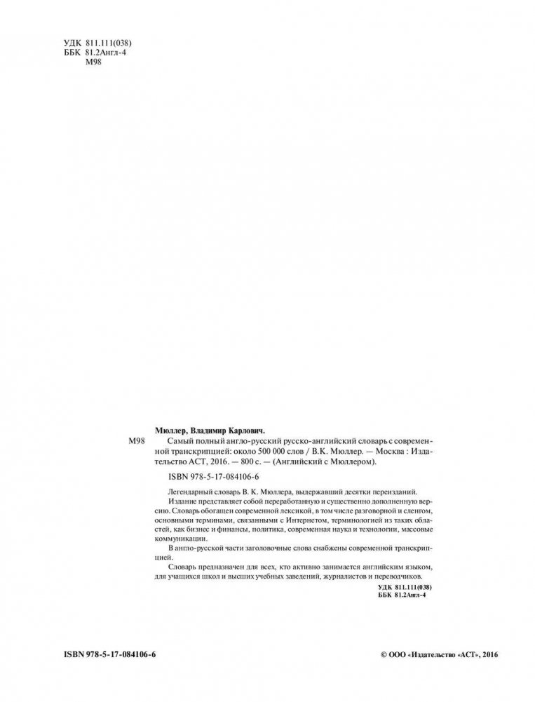 Легендарный словарь В.К. Мюллера, выдержавший десятки переизданий. Издание представляет собой переработанную и существенно дополненную версию. Словарь обогащен современной лексикой, в том числе разговорной и сленгом, основными терминами, связанными с Интернетом, терминологией из таких областей, как бизнес и финансы, политика, современная наука и технологии, массовые коммуникации. В англо-русской части заголовочные слова снабжены современной транскрипцией. Словарь предназначен для всех, кто активно занимается английским языком, для учащихся школ и высших учебных заведений, журналистов и переводчиков.