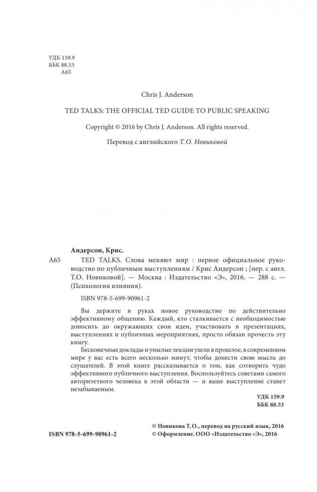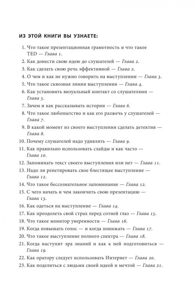 Вы держите в руках новое руководство по действительно эффективному общению. Каждый, кто сталкивается с необходимостью доносить до окружающих свои идеи, участвовать в презентациях, выступлениях и публичных мероприятиях, просто обязан прочесть эту книгу. Бесконечные доклады и унылые лекции ушли в прошлое, в современном мире у вас есть всего несколько минут, чтобы донести свою мысль до слушателей. В этой книге рассказывается о том, как сотворить чудо эффективного публичного выступления. Воспользуйтесь советами самого авторитетного человека в этой области – и ваше выступление станет незабываемым.