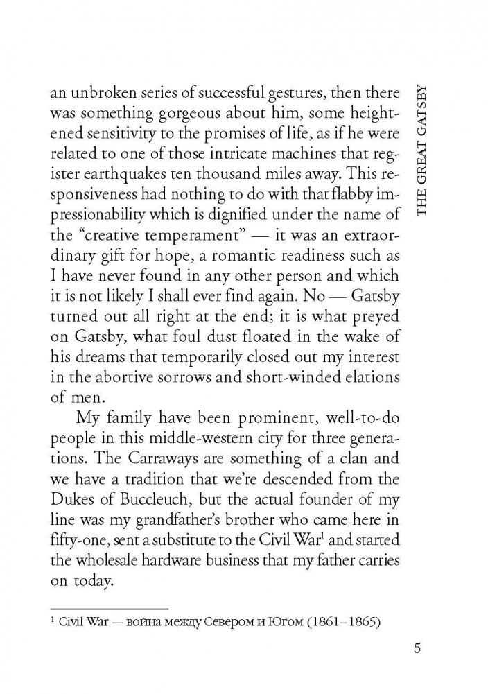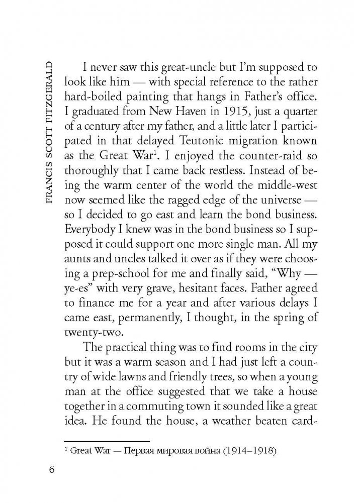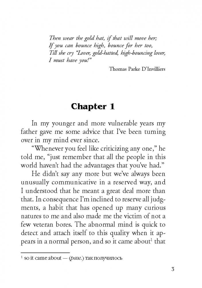 Фрэнсис Скотт Фицджеральд (1896-1940) - американский писатель и сценарист, классик американской литературы. Предлагаемый читателям психологический роман "Великий Гэтсби" (1925) нравственно развенчивает безоглядное восприятие "американской мечты" - идеи социального преуспеяния личности. Неадаптированный текст на языке оригинала снабжен постраничным комментарием и словарем.