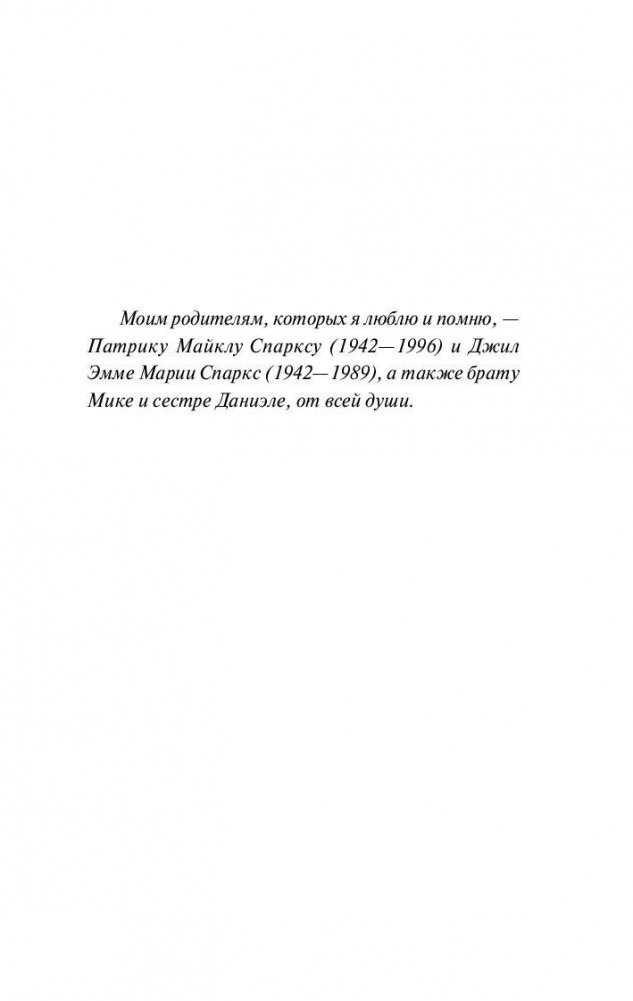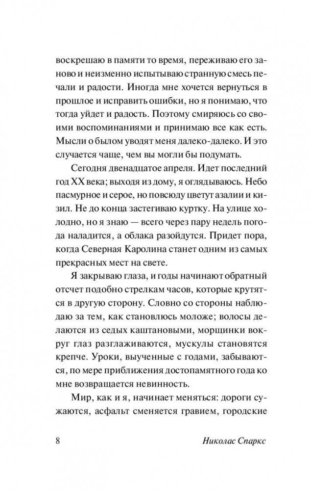 Тихий городок Бофор. Каждый год Лэндон Картер приезжает сюда, чтобы вспомнить историю своей первой любви… Историю страсти и нежности, много лет назад связавшей его, парня из богатой семьи, и Джейми Салливан, скромную дочь местного пастора. История радости и грусти, счастья и боли. Историю чувства, которое человеку доводится испытать лишь раз в жизни – и запомнить навсегда.