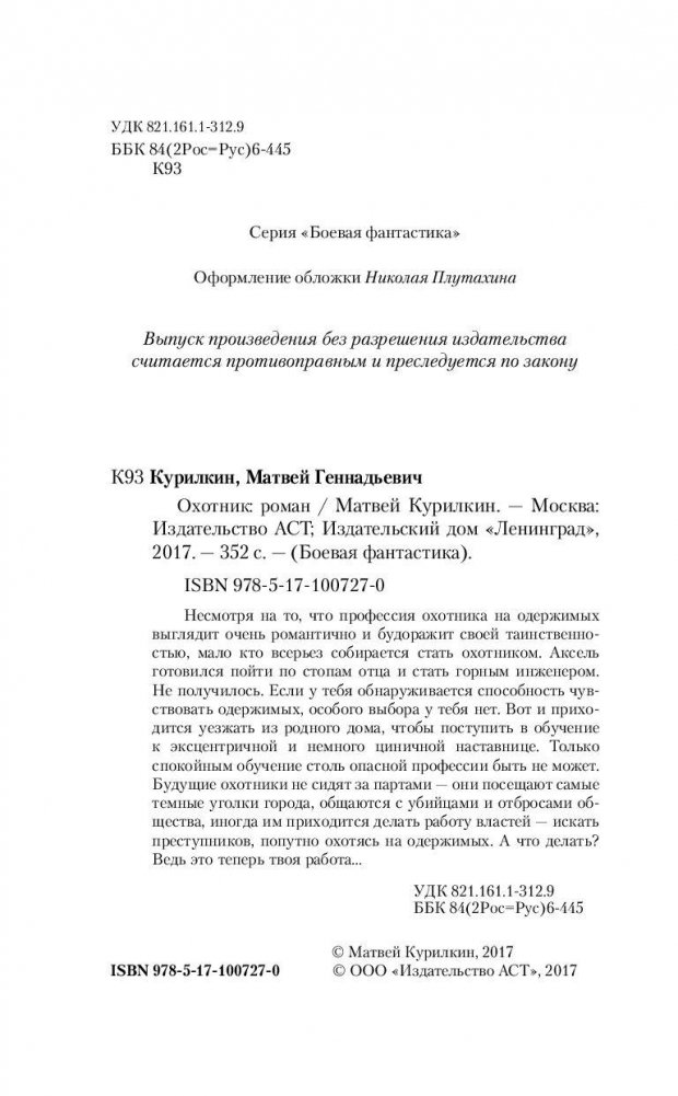 Несмотря на то, что профессия охотника на одержимых выглядит очень романтично и будоражит своей таинственностью, мало кто всерьез собирается стать охотником. Аксель готовился пойти по стопам отца и стать горным инженером. Не получилось. Если у тебя обнаруживается способность чувствовать одержимых, особого выбора у тебя нет. Вот и приходится уезжать из родного дома, чтобы поступить в обучение к эксцентричной и немного циничной наставнице. Только спокойным обучение столь опасной профессии быть не может. Будущие охотники не сидят за партами – они посещают самые темные уголки города, общаются с убийцами и отбросами общества, иногда им приходится делать работу властей – искать преступников, попутно охотясь на одержимых. А что делать? Ведь это теперь твоя работа…
