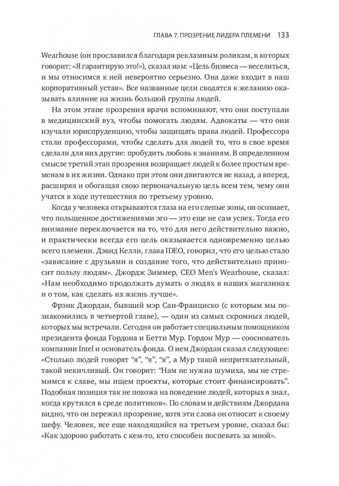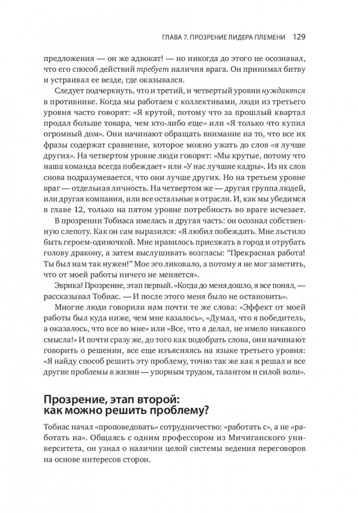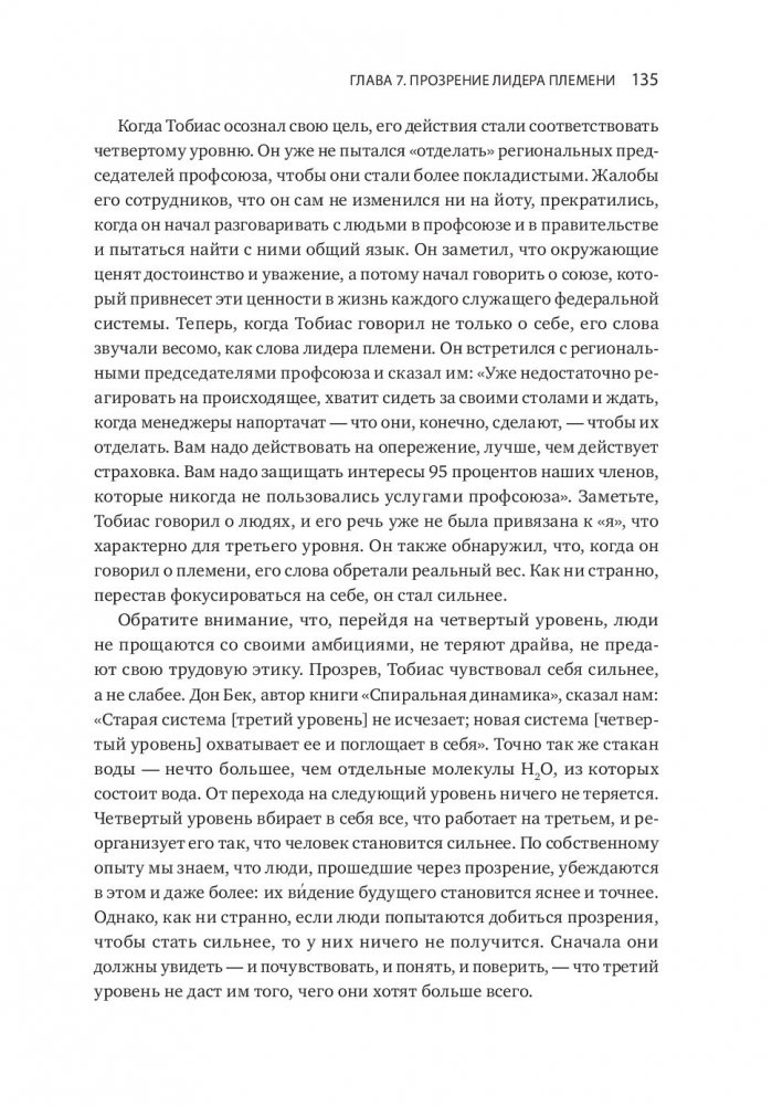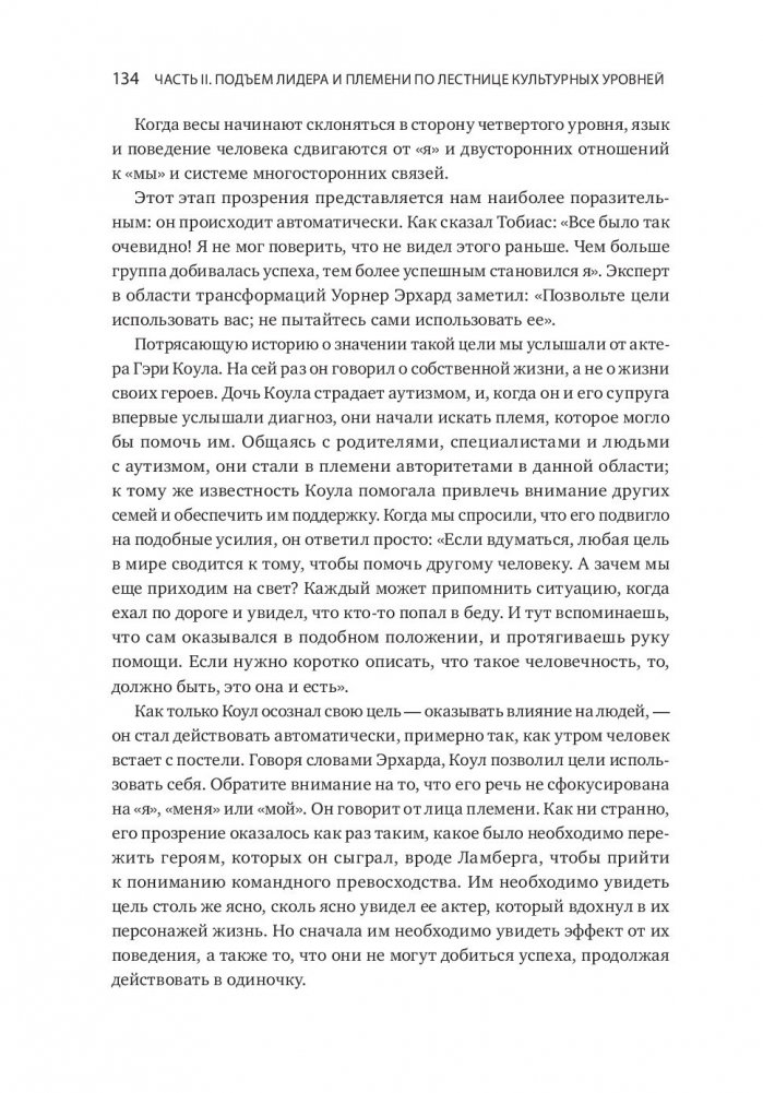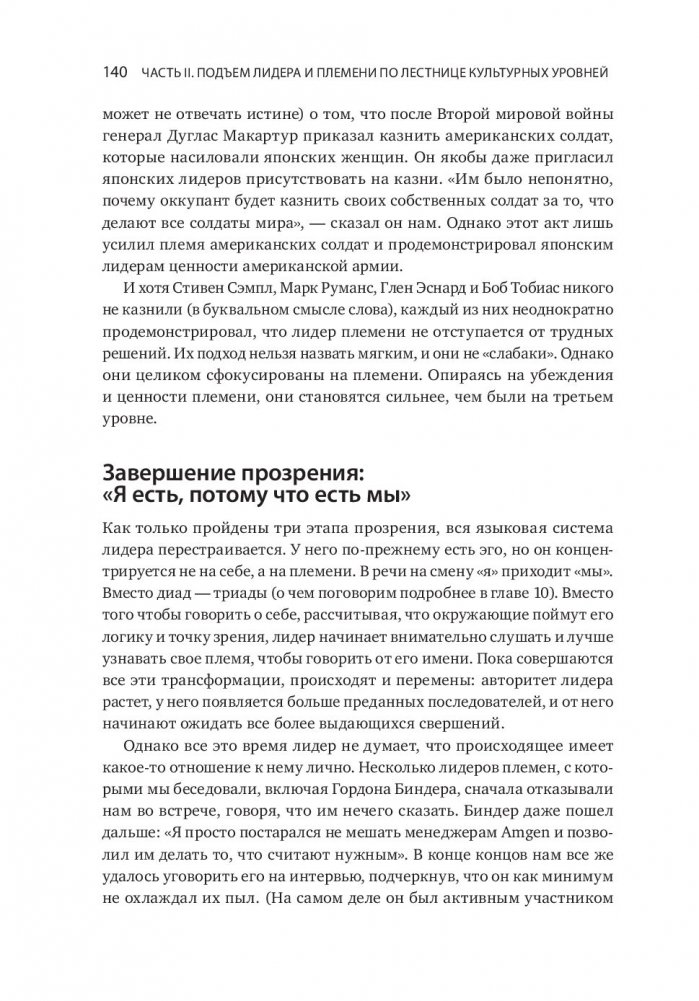 Увлекательная и прорывная книга, которая поможет создать сильную корпоративную культуру. Эта книга открывает нам глаза на один столь повсеместно распространенный факт: человеческие существа сбиваются в племена. Логан, Кинг и Фишер-Райт анализируют связь между племенами и теми, кто ими руководит. Авторы доказывают, что эта связь поднимает важные вопросы о том, как развиваются лидеры, как они становятся великими и какое наследие они оставляют. Выстраивая свое племя, лидер развивает его. Этот процесс, в свою очередь, оказывает влияние и на самого лидера. Подчиняя себя племени, он добивается такого величия, которое, казалось бы, недоступно отдельной личности. Книга — результат десятилетних полевых исследований с участием 24 тысяч человек из двух дюжин организаций. Но вместо того чтобы засыпать нас цифрами и таблицами, авторы нашли и описали людей, которые олицетворяют собой их идеи и открытия. В результате книга получилась одновременно и информативной, и увлекательной. Они выяснили, чем именно отличаются посредственные корпоративные племена от племен с высокоразвитой культурой. Более того, они обнаружили, что культура племен развивается поэтапно, переходя от одного уровня к другому: от разрушительной агрессивности и эгоцентричности к командному творчеству. Эта книга объясняет нам, почему некоторые племена отвергают любые разговоры о ценностях, характерах и благородстве, в то время как другие буквально требуют проведения таких дискуссий. Книга дает ответы еще на несколько занимательных вопросов. Почему выдающиеся лидеры нередко терпят поражение, попадая в новую среду? Почему средненькие лидеры порой кажутся лучше, чем они есть на самом деле? Почему классные стратегии чаще проваливаются, чем срабатывают? Авторы доказывают, что ответ кроется во взаимоотношениях между лидером и племенем. Великие лидеры строят великие племена, которые способны на великие дела, так как отдают должное своим великим лидерам.