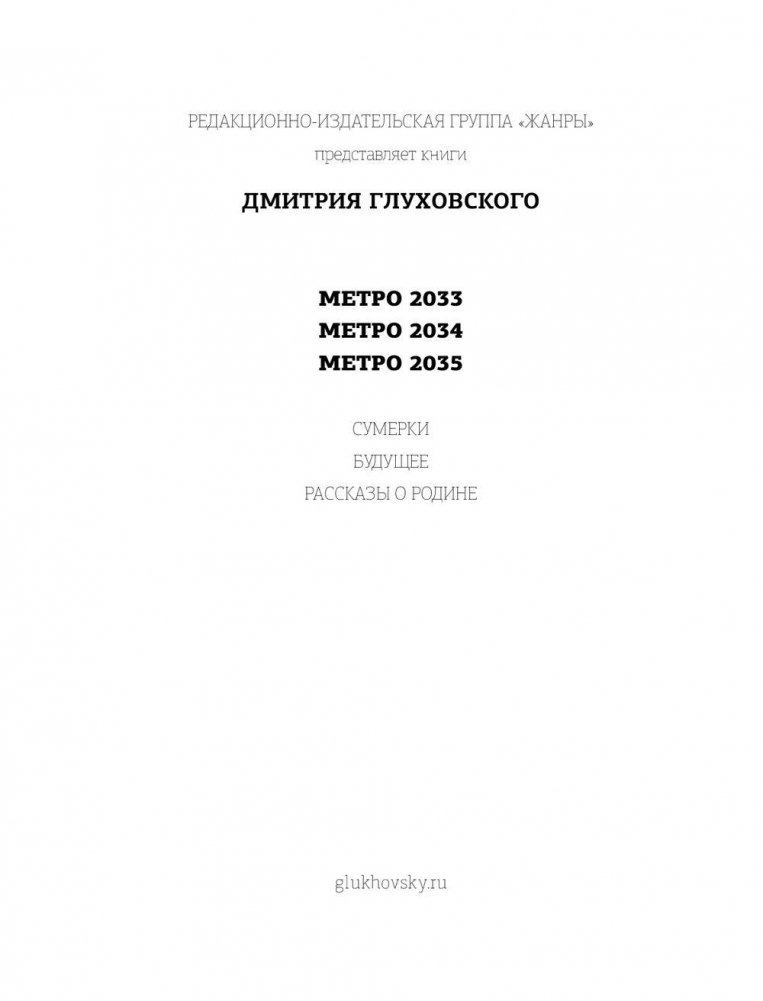 Окончательное издание трилогии. "Метро" Дмитрия Глуховского переведено на 37 языков мира и издано двухмиллионным тиражом. Третья мировая стерла человечество с лица Земли. Планета опустела. Мегаполисы обращены в прах и пепел. Железные дороги ржавеют. Спутники одиноко болтаются на орбите. Радио молчит на всех частотах. Выжили только те, кто услышав сирены тревоги, успел добежать до дверей московского метро. Там, на глубине в десятки метров, на станциях и в туннелях, люди пытаются переждать конец света. Там они создали новый мирок вместо потерянного огромного мира. Они цепляются за жизнь изо всех сил и отказываются сдаваться. Они мечтают вернуться наверх — однажды, когда радиационный фон от ядерных бомбардировок спадет. И не оставляют надежды найти других выживших... Перед вами — наиболее полное коллекционное издание трилогии "Метро". Впервые "Метро 2033", "Метро 2034", "Метро 2035" и новелла "Евангелие от Артема" выходят под одной обложкой. Дмитрий Глуховский ставит точку в саге, над которой работал двадцать лет.