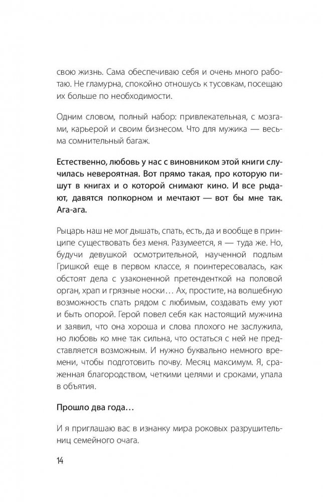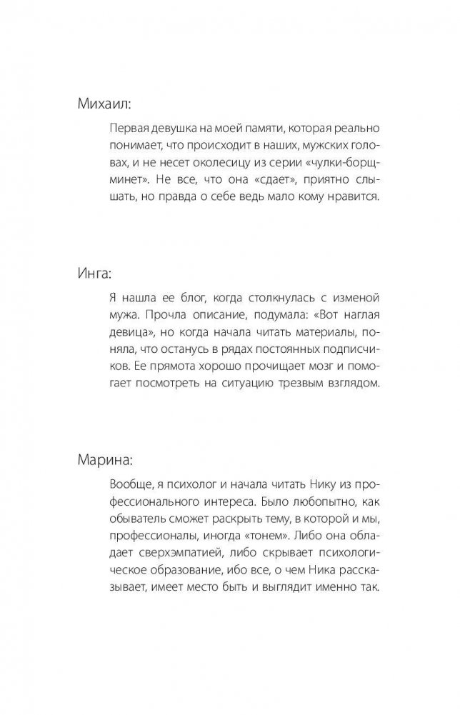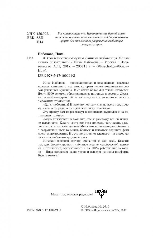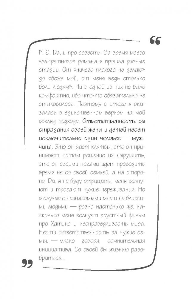 Ника Набокова – провокационная и откровенная, красивая молодая женщина с мозгами, которым может позавидовать любой успешный мужчина. В ее блоге более 300 тысяч читателей. Почти 8000 человек, обратившихся за помощью и советом. Десятки тысяч благодарностей от тех, кому ее статьи помогли выжить в сложных отношениях. «Да, я любовница! И именно поэтому я знаю все о том, почему, из-за чего, ради чего и для чего люди изменяют. Эту правду вам не расскажут в глянцевых журналах и на популярных ток-шоу. Добро пожаловать в мой мир, где я расскажу все об изнанке неверности. Какого черта его туда понесло, чего ждать дальше и что с этим всем делать? Меня можно ненавидеть, обвинять в разрушении чьей-то семьи, бояться и пытаться отрицать факт моего существования. Но это не отменяет главного – я знаю, как выжить в любовном треугольнике». Никакой женской логики, стенаний и «ой, все». Бьющие под дых формулировки, глубинное знание человеческой психики и отношений, эффективные и на 100% работающие методики – Ника расшатает ваши устои и выведет из зоны комфорта. Будьте готовы!