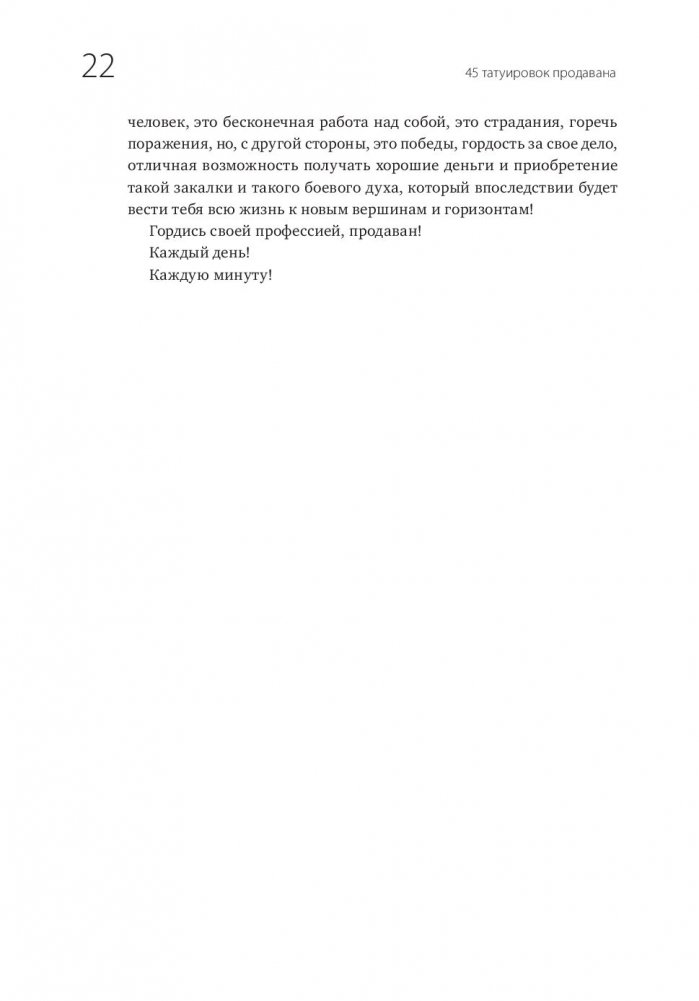 Новые 45 татуировок из продавцового прошлого Максима Батырева — как в роли рядового менеджера по продажам, так и в роли руководителя: успехи, неудачи, выводы из них. Одна из самых непростых и в то же время интересных профессий — это профессия человека, который ежедневно, ежечасно и ежеминутно защищает интересы организации, проводя коммерческие переговоры с её потенциальными заказчиками и будущими партнерами. Максим Батырев уверен: все, чего он достиг в своей профессиональной деятельности, он достиг благодаря работе в продажах. Продажи учат защищать свои интересы, выступать публично, вести переговоры с клиентами, делать своими руками презентации, внятно формулировать свои мысли и многому другому. Продажи делают людей сильными. Если вы научитесь продавать товары с не самой очевидной выгодой на одном из самых высококонкурентных рынков, то вам по плечу будут практически любые бизнес-задачи. В своей новой книге Максим рассказывает о 45 татуировках продавца, которые появились за пятнадцать лет, во время которых он учился продавать.