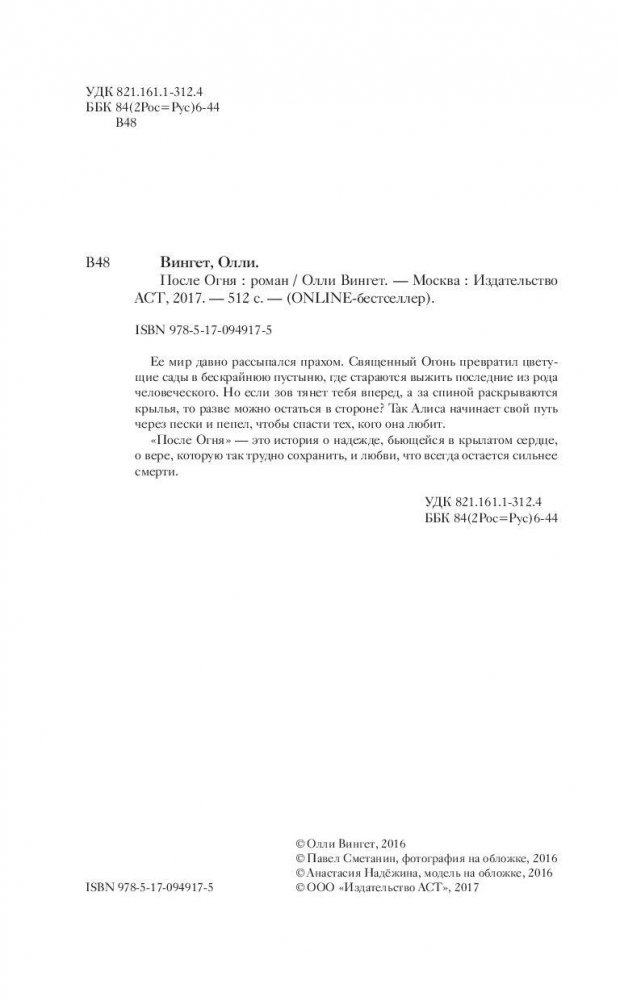 Ее мир давно рассыпался прахом. Священный Огонь превратил цветущие сады в бескрайнюю пустыню, где стараются выжить последние из рода человеческого. Но если зов тянет тебя вперед, а за спиной раскрываются крылья, то разве можно остаться в стороне? Так Алиса начинает свой путь через пески и пепел, чтобы спасти тех, кого она любит. «После Огня» – это история о надежде, бьющейся в крылатом сердце, о вере, которую так трудно сохранить, и любви, что всегда остается сильнее смерти.