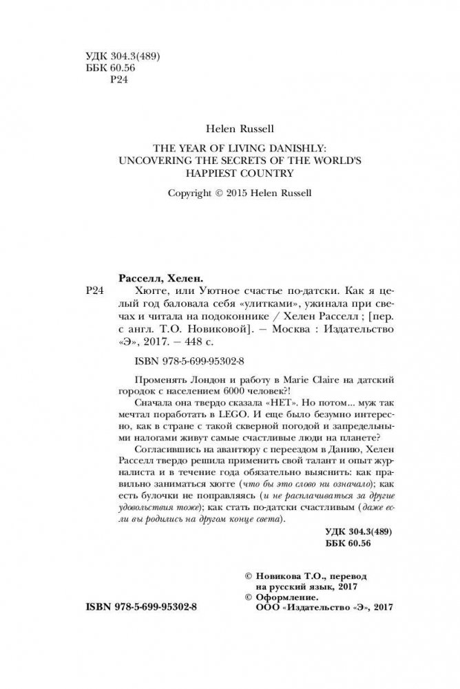 Променять Лондон и работу в Marie Claire на датский городок с населением 6000 человек?! Сначала она твердо сказала «НЕТ». Но потом… муж так мечтал поработать в LEGO. И еще было безумно интересно, как в стране с такой скверной погодой и запредельными налогами живут самые счастливые люди на планете? Согласившись на авантюру с переездом в Данию, Хелен Расселл твердо решила применить свой талант и опыт журналиста и в течение года обязательно выяснить: как правильно заниматься хюгге (что бы это слово ни означало); как есть булочки не поправляясь (и не расплачиваться за другие удовольствия тоже); как стать по-датски счастливым (даже если вы родились на другом конце света).