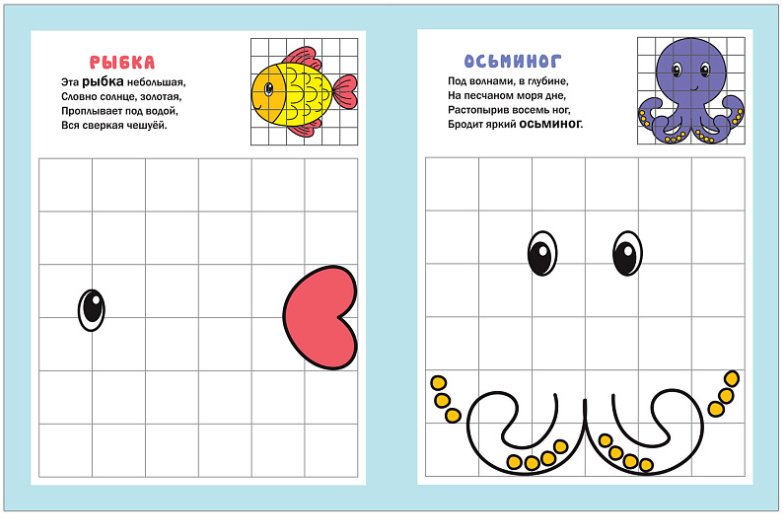 С книгой «В море» серии «Рисуем по клеточкам» так легко научиться рисовать кита, дельфина, морского конька и других животных! На каждой странице малыш найдет поле в клеточку, на котором обозначены некоторые элементы рисунка. Задача маленького художника – дорисовать картинку, глядя на образец в правом верхнем углу. Сделать это будет совсем не сложно, и благодаря забавным стихам – весело. Рисование по клеточкам способствует развитию мелкой моторики, художественного восприятия, пространственного и логического мышления, а также концентрации внимания.