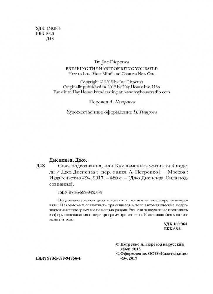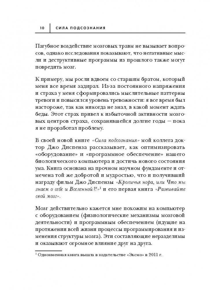 Подсознание может делать только то, на что вы его запрограммировали. Невозможно остановить хранящиеся в теле автоматические подсознательные программы с помощью разума. Эта книга научит вас проникать в сферу подсознания и перепрограммировать его. Изменившийся мозг изменит и тело.