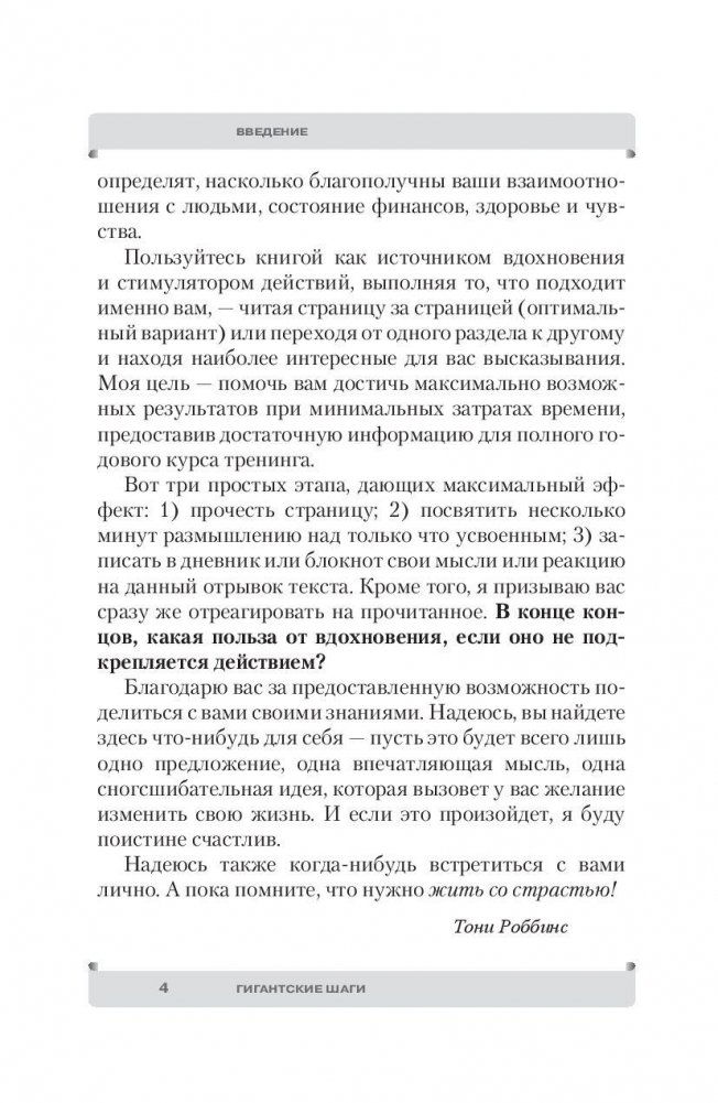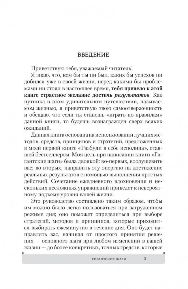 На основе лучших приемов, методов, принципов и стратегий, представленных в бестселлере «Разбуди в себе исполина», гуру пиковой производительности Тони Роббинс предлагает вам 365 уроков личностного роста на каждый день года. Эти вдохновляющие мысли и небольшие шаги-упражнения в итоге приведут к колоссальному повышению уровня вашей жизни. Помимо простой целеустремленности и силы воли Роббинс научит вас использовать ряд конкретных инструментов, от которых зависит качество ваших отношений, финансов, здоровья и эмоций, что в итоге позволит за минимальное время получить максимальный результат по всем этим фронтам.