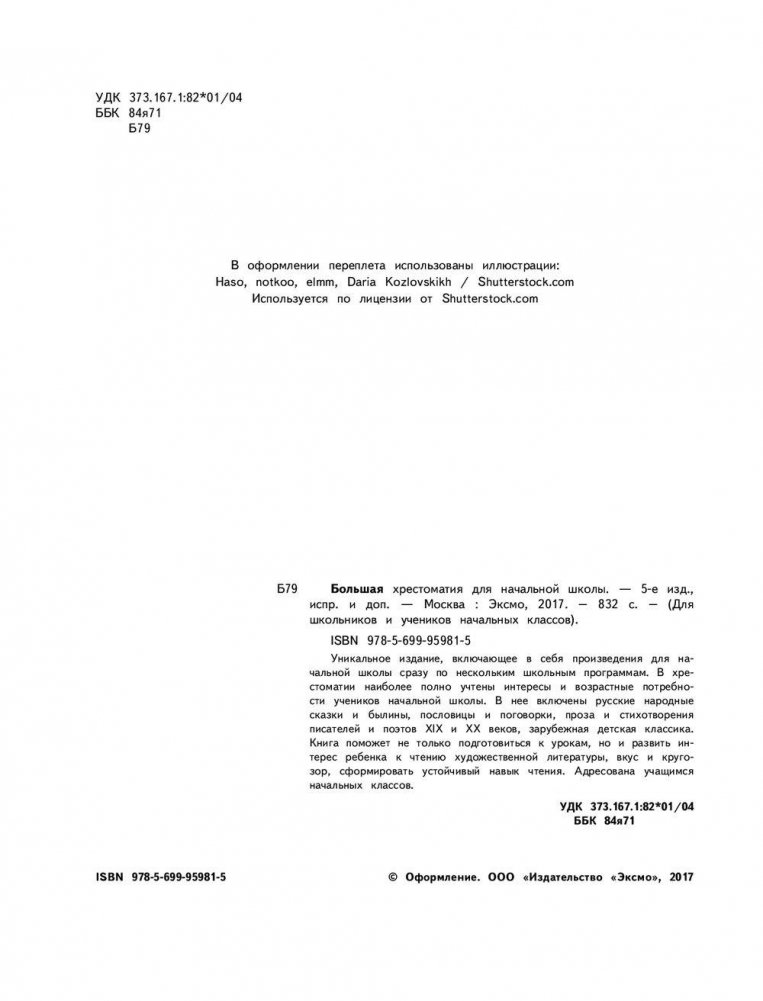 Уникальное издание, включающее в себя произведения для начальной школы сразу по нескольким школьным программам. В хрестоматии наиболее полно учтены интересы и возрастные потребности учеников начальной школы. В нее включены русские народные сказки и былины, пословицы и поговорки, проза и стихотворения писателей и поэтов XIX и XX веков, зарубежная детская классика. Книга поможет не только подготовиться к урокам, но и развить интерес ребенка к чтению художественной литературы, вкус и кругозор, сформировать устойчивый навык чтения. Адресована учащимся начальных классов.
