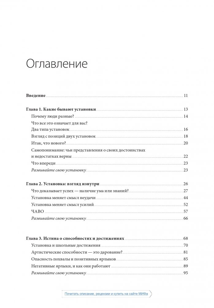 Люди с фиксированным сознанием (с установкой на данность) верят, что врожденные ум и талант неизменны. Они тратят время на то, чтобы доказать всем, что они умны и талантливы, вместо того, чтобы развивать свои таланты. Кроме того, они верят, что талант ведет к успеху сам по себе. И они ошибаются. Люди с гибким сознанием (с установкой на рост) верят, что все качества можно развить, планомерно работая над собой, а изначальный уровень интеллекта и таланта — это всего лишь стартовая точка. Такой подход формирует любовь к постоянному обучению и устойчивость к трудностям и неудачам.