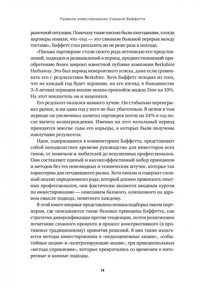 Инвестиционного гуру Уоррена Баффетта многие называют «провидцем». Сам Баффетт говорит, что предсказывать поведение рынка бессмысленно и только терпение, бережливость и верность принципам помогут достичь долговременного успеха. Такого прагматичного подхода он придерживается с момента организации своего первого товарищества Buffett Partnership Limited (BPL) в 1956 г. Именно тогда молодой Баффетт начал раз в полугодие рассылать партнерам письма, в которых рассказывал о результатах работы и подробно объяснял свои методы инвестирования. Баффетт не пишет книг, но его письма партнерам, собранные в этом издании, дают возможность понять образ мыслей и философию инвестирования великого предпринимателя. Автор — составитель книги инвестиционный аналитик Джереми Миллер, объединив письма по темам, анализирует историю успеха компании BPL с 1956 по 1970 г. — периода, по признанию самого Баффетта, с самой высокой доходностью, которую он когда-либо получал. Изложенные здесь подходы, несмотря на эволюцию в методах инвестирования, не теряют актуальности и по сей день.
