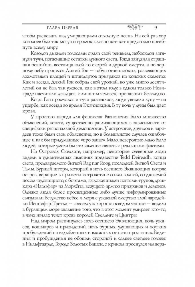 Что-то кончается. Надвигается Tedd Deireadh, Час Конца… Это чувствуется в воздухе и в воде, в шелесте трав и в гуле ветров, в крови закатов и в ослепительных сполохах северного сияния на зубчатых остриях вершины величественной черной башни. Места, в которое ведет нелегкий путь пепельноволосую девочку на вороной кобылице – по залитому кровью друзей постоялому двору… по залитому кровью бойцов песку арены… по залитому кровью врагов льду озера Тарн Мира. Ведь дело не в том, что ты терпишь страдания. Дело в том, как ты их терпишь. И во имя чего. Лишь постигший эту истину сможет войти в Tor Zireael. Башню Ласточки. Сага А. Сапковского давно занимает почетное место в мировой традиции жанра фэнтези, а Геральт стал культовым персонажем не только в мире литературы, но и в универсуме компьютерных игр. Шестая книга из цикла «Ведьмак» впервые выходит с иллюстрациями Дениса Гордеева, созданными специально для этого издания.