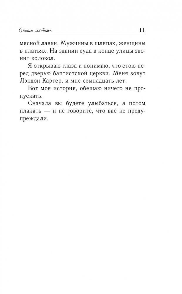 Тихий городок Бофор. Каждый год Лэндон Картер приезжает сюда, чтобы вспомнить историю своей первой любви… Историю страсти и нежности, много лет назад связавшей его, парня из богатой семьи, и Джейми Салливан, скромную дочь местного пастора. История радости и грусти, счастья и боли. Историю чувства, которое человеку доводится испытать лишь раз в жизни – и запомнить навсегда…