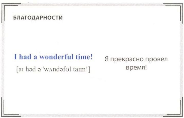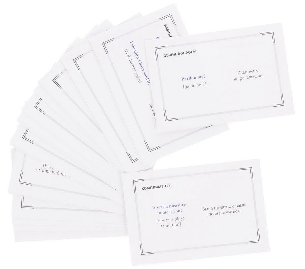 Освоить на начальном уровне английскую разговорную речь вам помогут простые упражнения с карточками. Для заучивания фраз вы можете: • раскладывать карточки по темам и читать их вслух, постепенно убирая те, которые вы уже твердо запомнили; • переписывать по одной карточке за раз; • закрывать английские фразы, оставляя только перевод, и устраивать себе проверку; • повесить на видном месте карточки с теми фразами, которые вам сложнее всего запомнить.