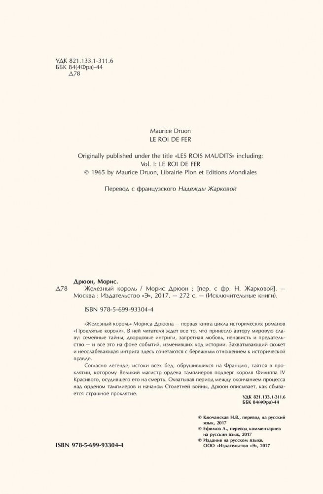 "Железный король" Мориса Дрюона — первая книга цикла исторических романов "Проклятые короли". В ней читателя ждет все то, что принесло автору мировую славу: семейные тайны, дворцовые интриги, запретная любовь, ненависть и предательство — и все это на фоне событий, изменивших ход истории. Захватывающий сюжет и неослабевающая интрига здесь сочетаются с бережным отношением к исторической правде. Согласно легенде, истоки всех бед, обрушившихся на Францию, таятся в проклятии, которому Великий магистр ордена тамплиеров подверг короля Филиппа IV Красивого, осудившего его на смерть. Охватывая период между окончанием процесса над орденом тамплиеров и началом Столетней войны, Дрюон описывает, как сбывается страшное проклятие.